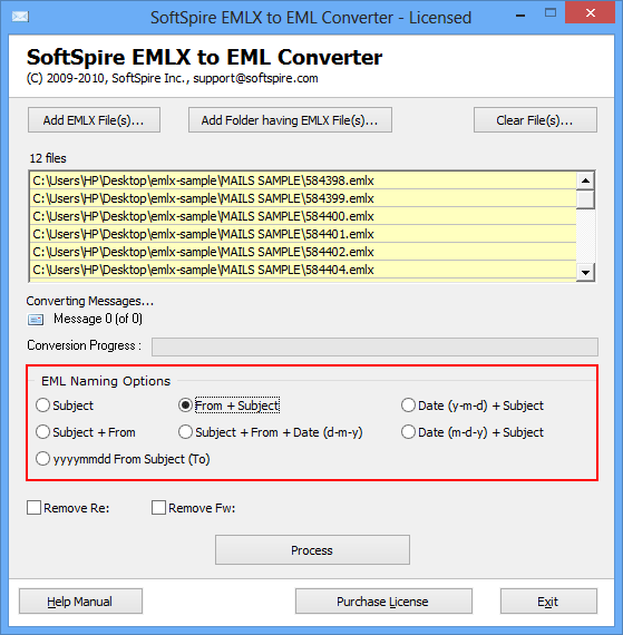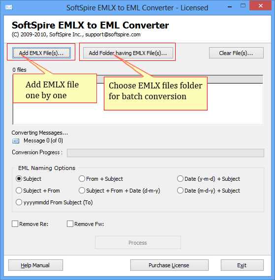 - Add Folder having EMLX Files: Use this button to choose EMLX files folder at once for conversion. This Batch mode option will help to convert whole EMLX file folder into EML format at once.